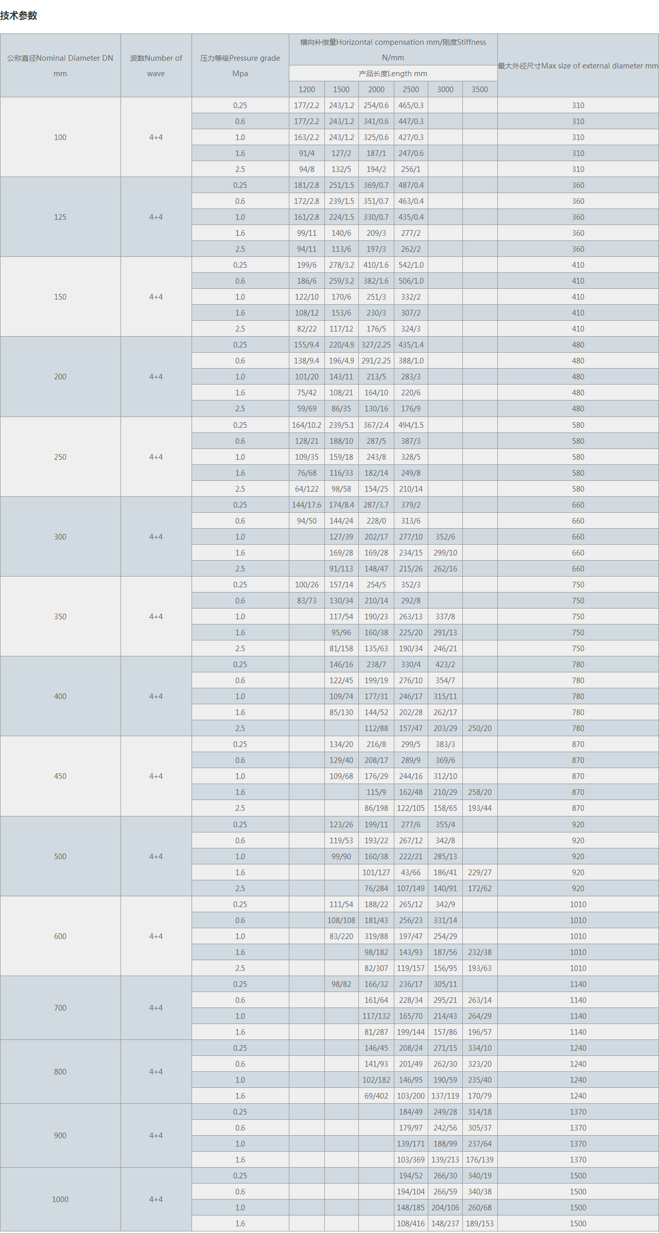 | 公稱直徑Nominal Diameter DN mm | 波數Number of wave | 壓力等級Pressure grade Mpa | 橫向補償量Horizontal compensation mm/剛度Stiffness N/mm | 很大外徑尺寸Max size of external diameter mm | |||||