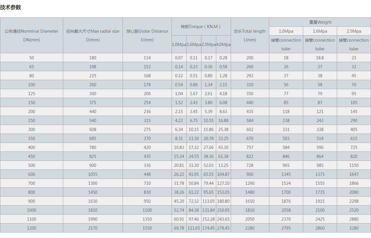 公稱通徑Norminal Diameter DN(mm) 徑向很大尺寸Max radial size D(mm) 球心距Globe Distance E(mm) 轉(zhuǎn)矩Torque(KN.M) 總長Total length L(mm)  重量Weight