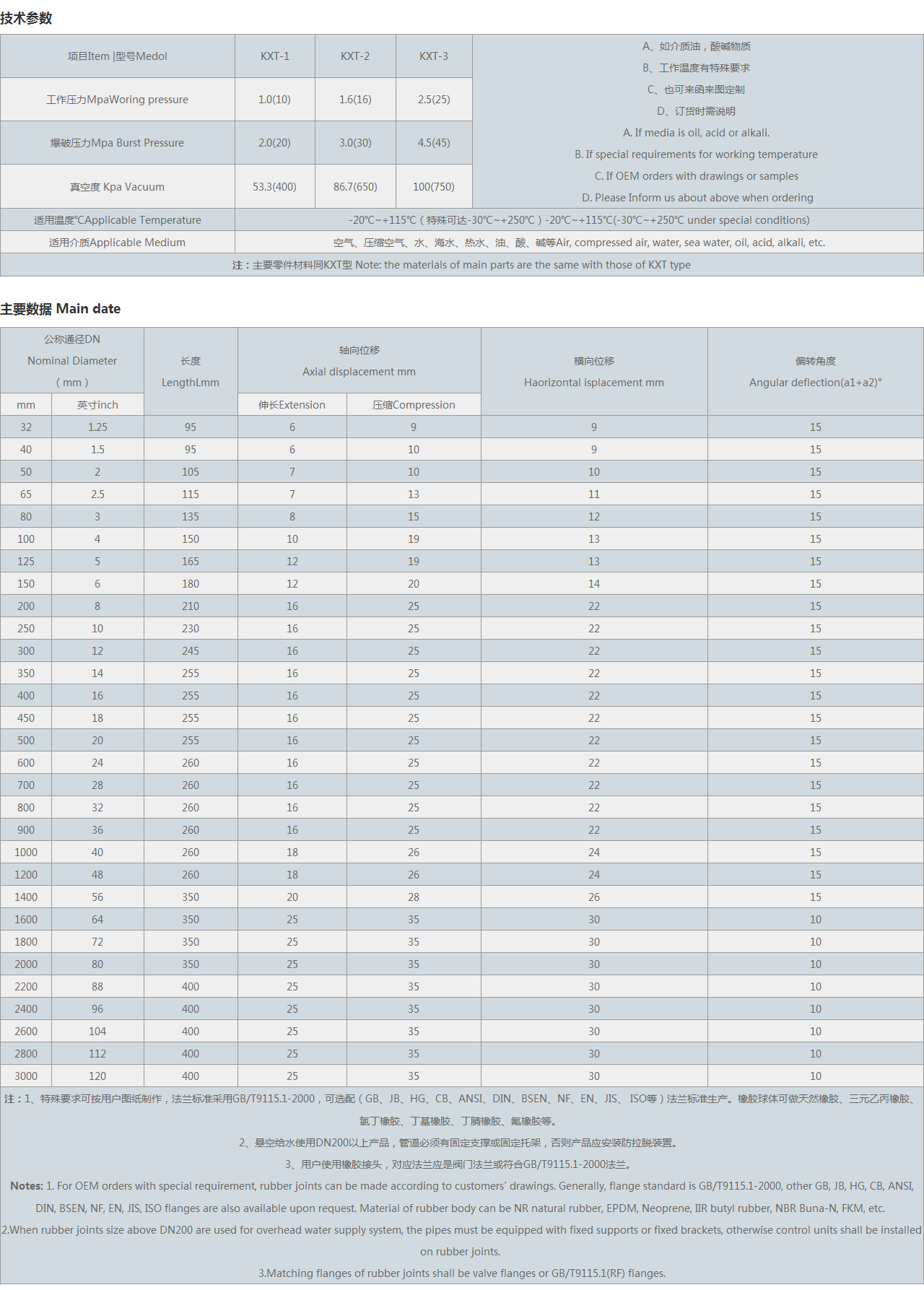 | 注:1、特殊要求可按用戶圖紙制作,可選配(GB、JB、HG、CB、ANSI、DIN、BSEN、NF、EN、JIS、 等)法蘭標準生產。橡膠球體可做天然橡膠、三元乙丙橡膠、氯丁橡膠、丁基橡膠、丁腈橡膠、氟橡膠等。 2、懸空給水使用DN200以上產品,管道必須有固定支撐或固定托架,否則產品應安裝防拉脫裝置。 3、用戶使用橡膠接頭,對應法蘭應是閥門法蘭。 Notes: 1. For OEM orders with special requirement, rubber joints can be made according to customers' drawings. Generally, flange standard is, other GB, JB, HG, CB, ANSI, DIN, BSEN, NF, EN, JIS, flanges are also available upon request. Material of rubber body can be NR natural rubber, EPDM, Neoprene, IIR butyl rubber, NBR Buna-N, FKM, etc. 2.When rubber joints size above DN200 are used for overhead water supply system, the pipes must be equipped with fixed supports or fixed brackets, otherwise control units shall be installed on rubber joints. 3.Matching flanges of rubber joints shall be valve flanges or flanges. |