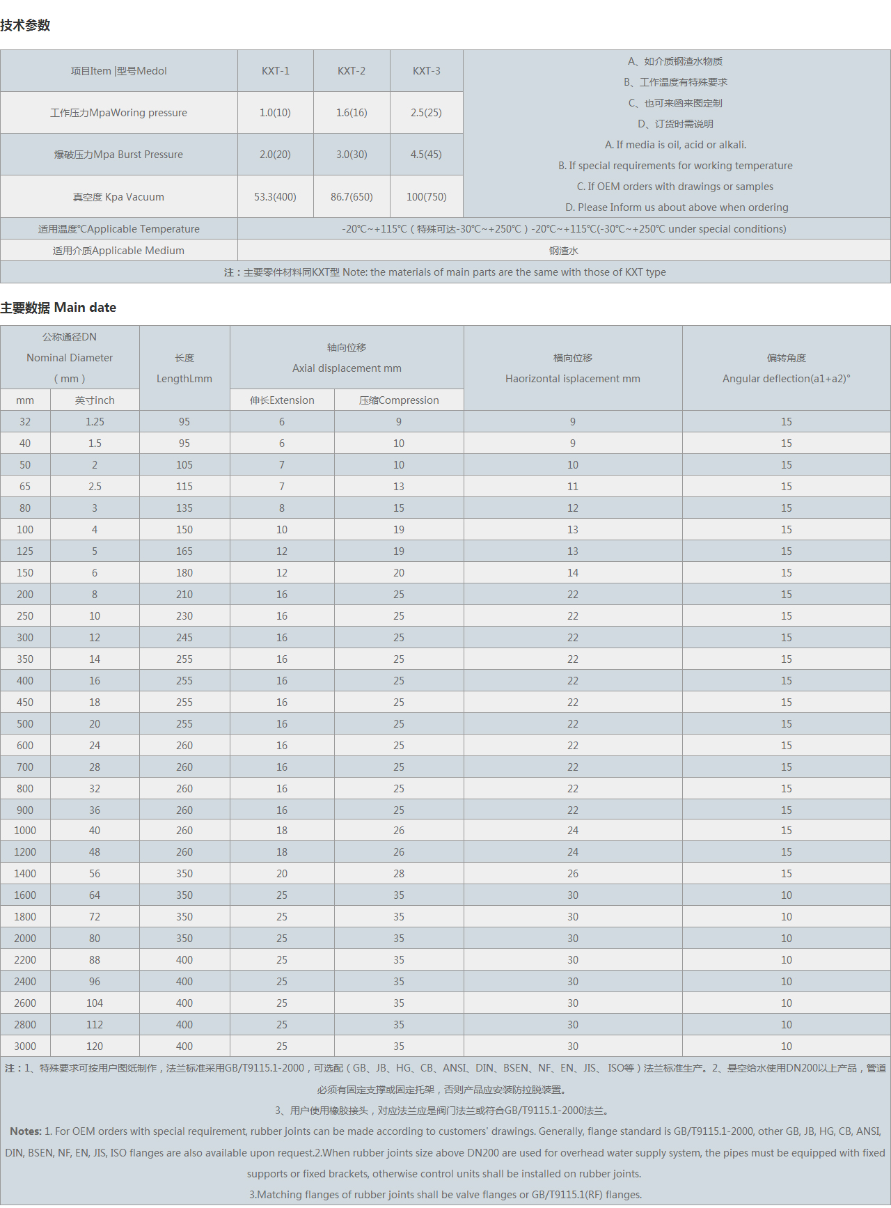 | 注:1、特殊要求可按用戶圖紙制作,可選配(GB、JB、HG、CB、ANSI、DIN、BSEN、NF、EN、JIS、 等)法蘭標準生產。2、懸空給水使用DN200以上產品,管道必須有固定支撐或固定托架,否則產品應安裝防拉脫裝置。 3、用戶使用橡膠接頭,對應法蘭應是閥門法蘭。 Notes: 1. For OEM orders with special requirement, rubber joints can be made according to customers' drawings. Generally, flange standard is , other GB, JB, HG, CB, ANSI, DIN, BSEN, NF, EN, JIS, flanges are also available upon request.2.When rubber joints size above DN200 are used for overhead water supply system, the pipes must be equipped with fixed supports or fixed brackets, otherwise control units shall be installed on rubber joints. 3.Matching flanges of rubber joints shall be valve flanges or flanges. |